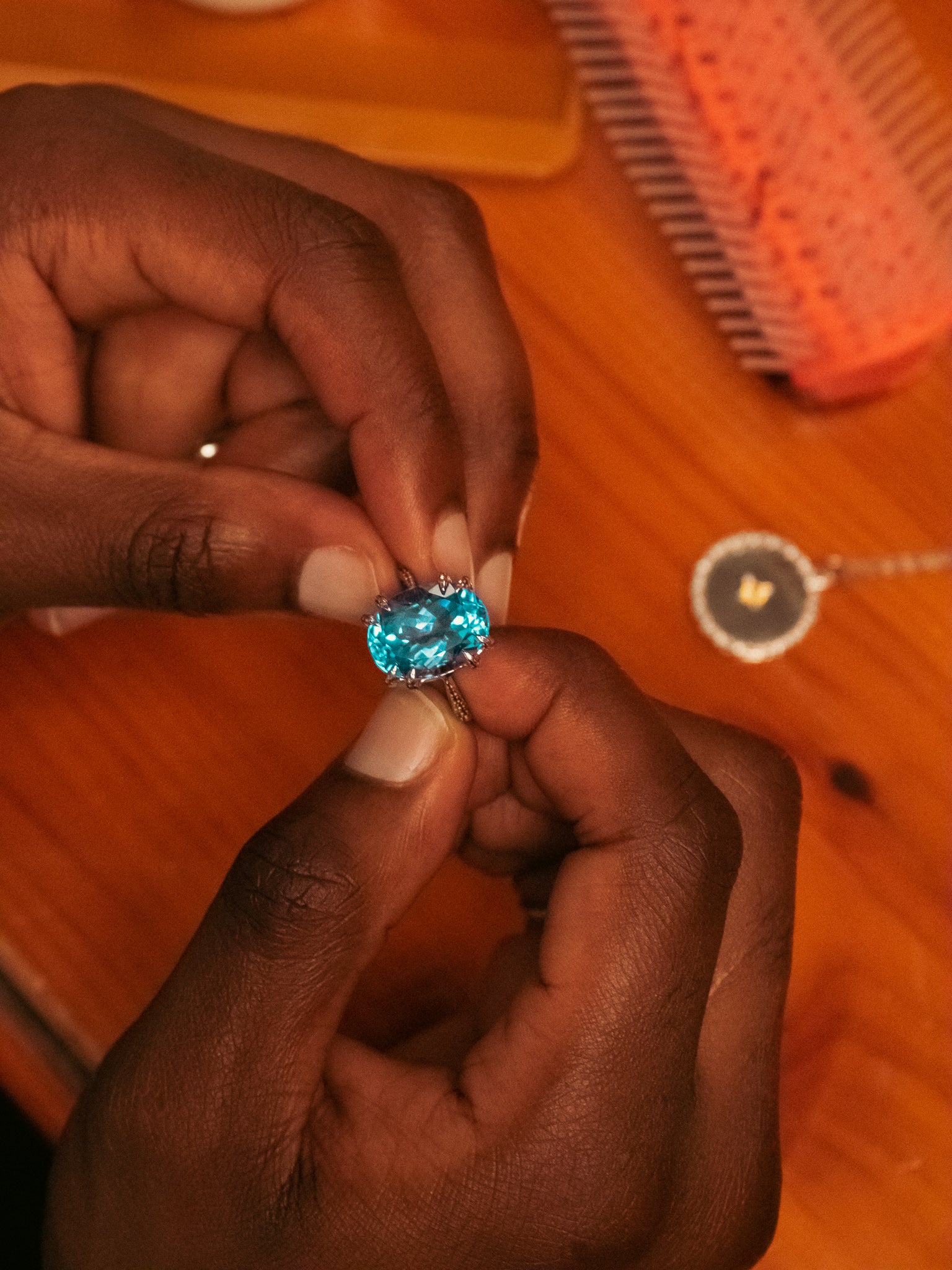 If you are wearing a statement ring on one hand, try to keep the jewellery on your other hand simple. You don't want to overwhelm your look with too much jewellery.