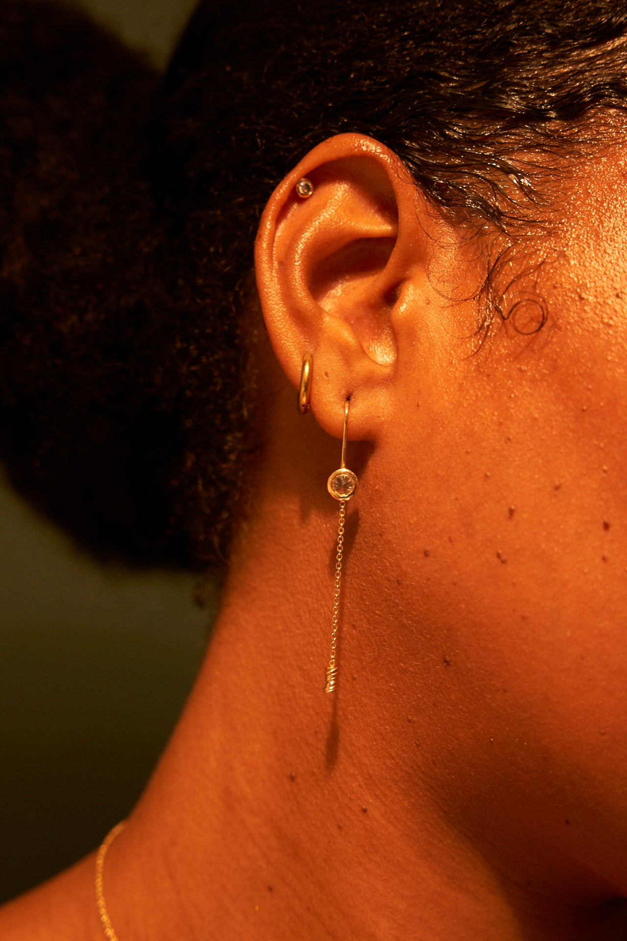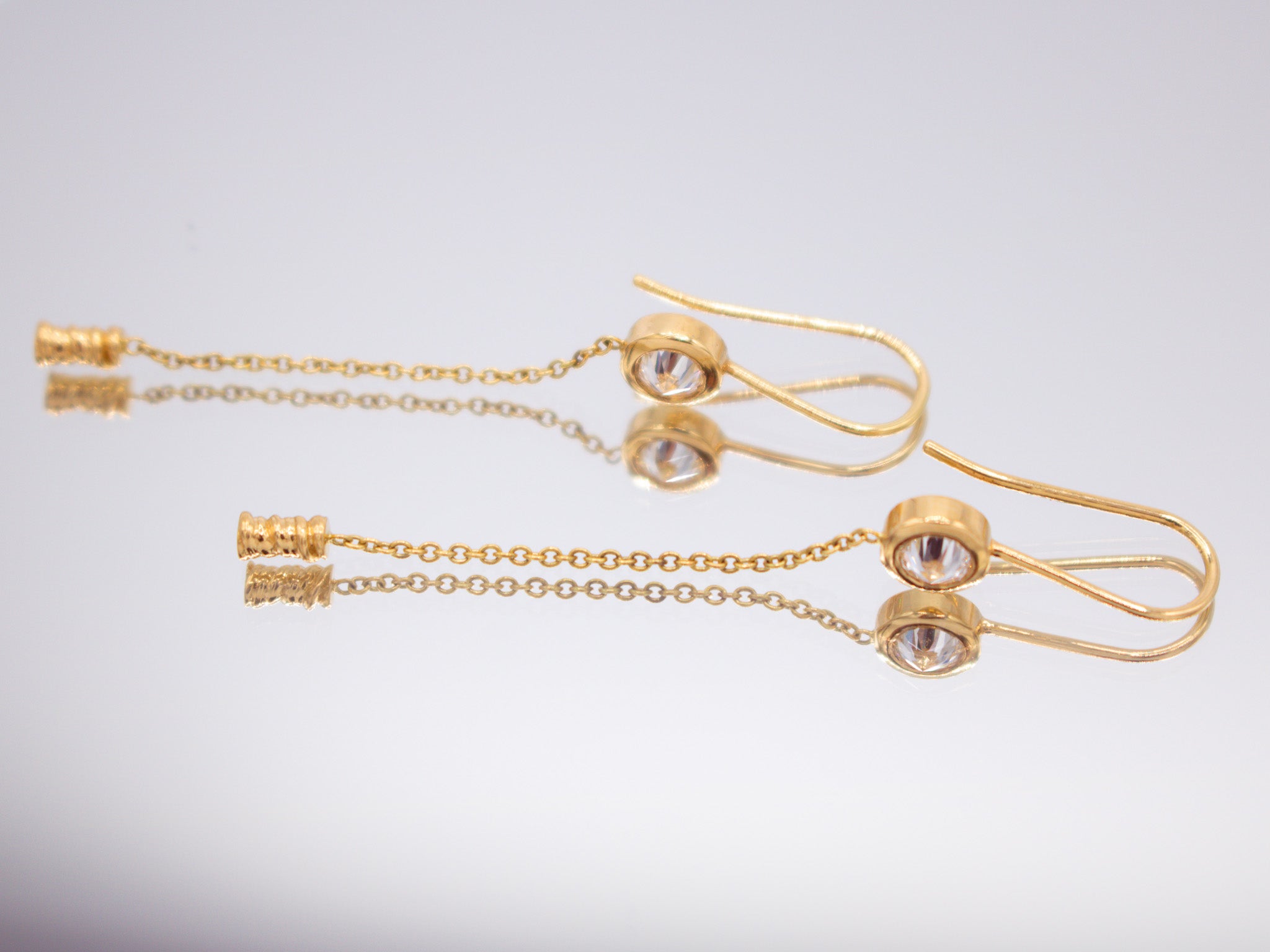 The earrings feature a delicate chain design that is adorned with sparkling diamonds. The diamonds dance and shimmer as you move, creating a truly mesmerising effect. The earrings also feature Kassandra Gordon's signature braid thread motif, which adds a touch of elegance and sophistication.